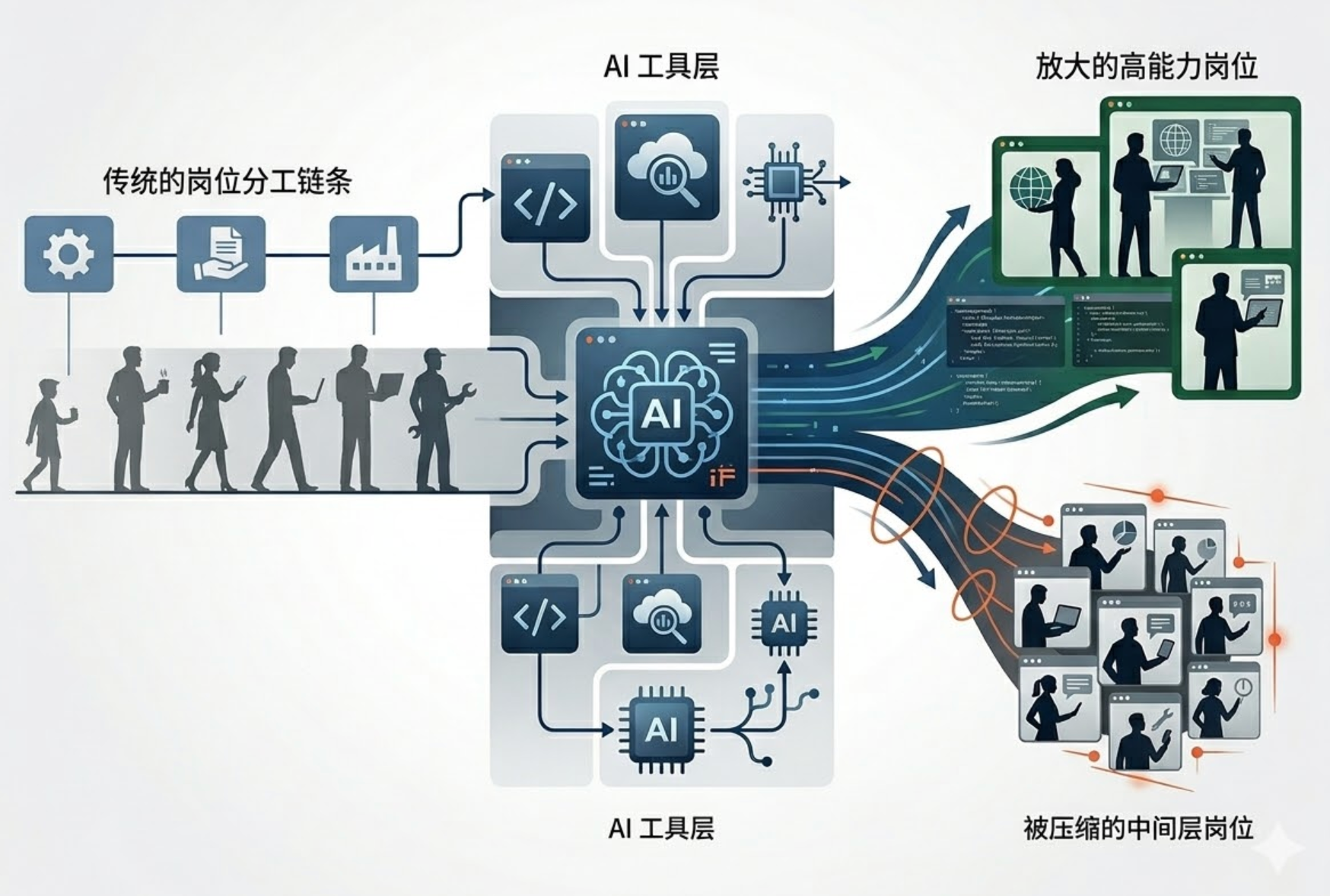 它会让本来就有判断力、工具能力和独立交付能力的人,产出进一步放大;也会让那些主要依赖重复执行、流程衔接和中间协调工作的人,更快感受到岗位压力。
