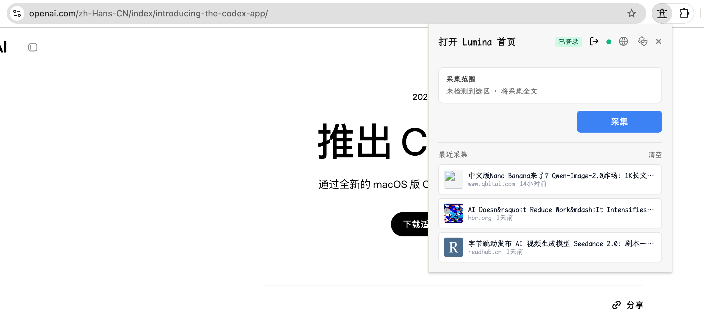- 浏览器采集工作流:支持全文/选区一键采集(弹窗与右键菜单),并内置最近采集与错误日志。
